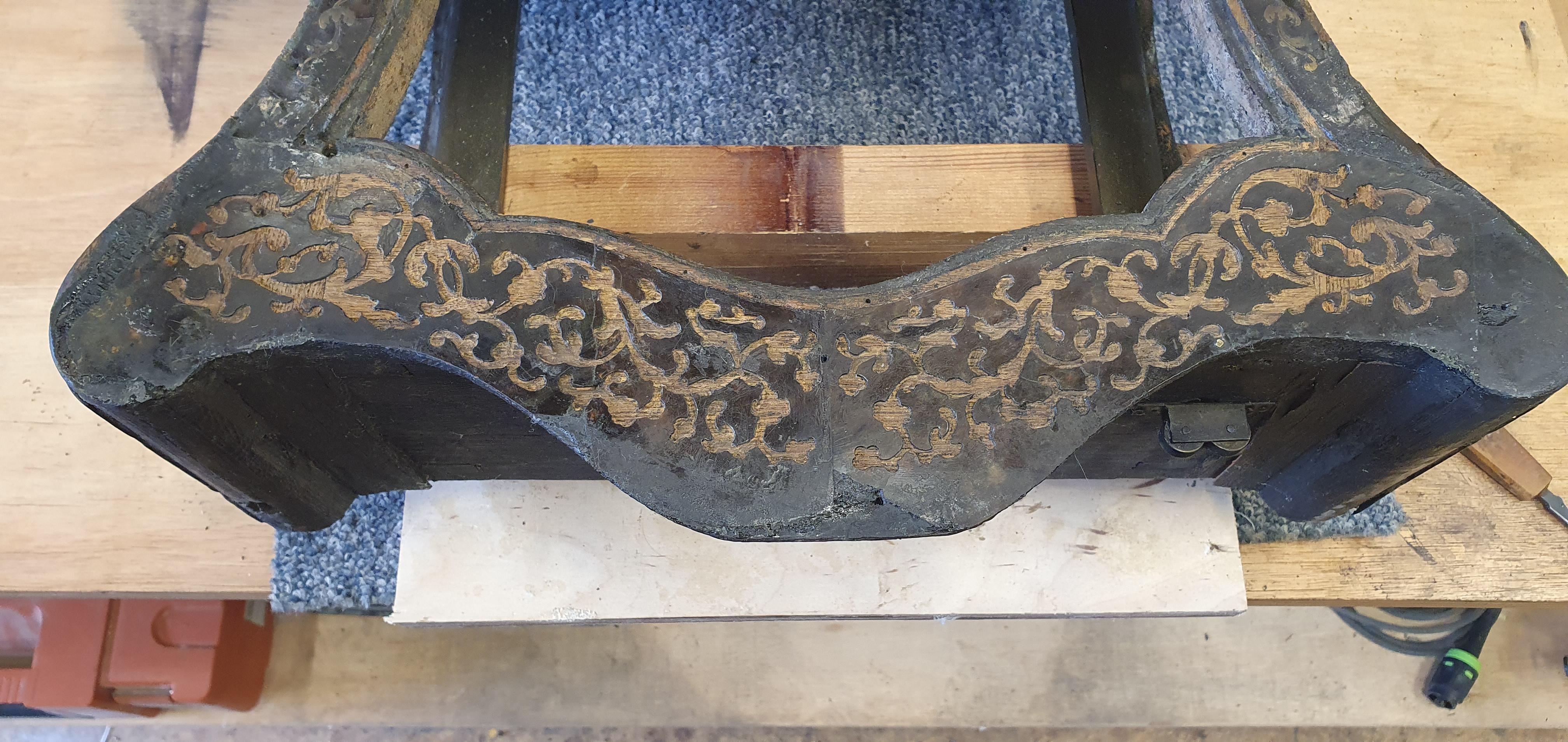 Retrait de la marqueterie en laiton : La première étape consistait à retirer délicatement toute la marqueterie en laiton, en veillant à préserver l'écaille de tortue qui se trouvait sur le bâti du cartel.