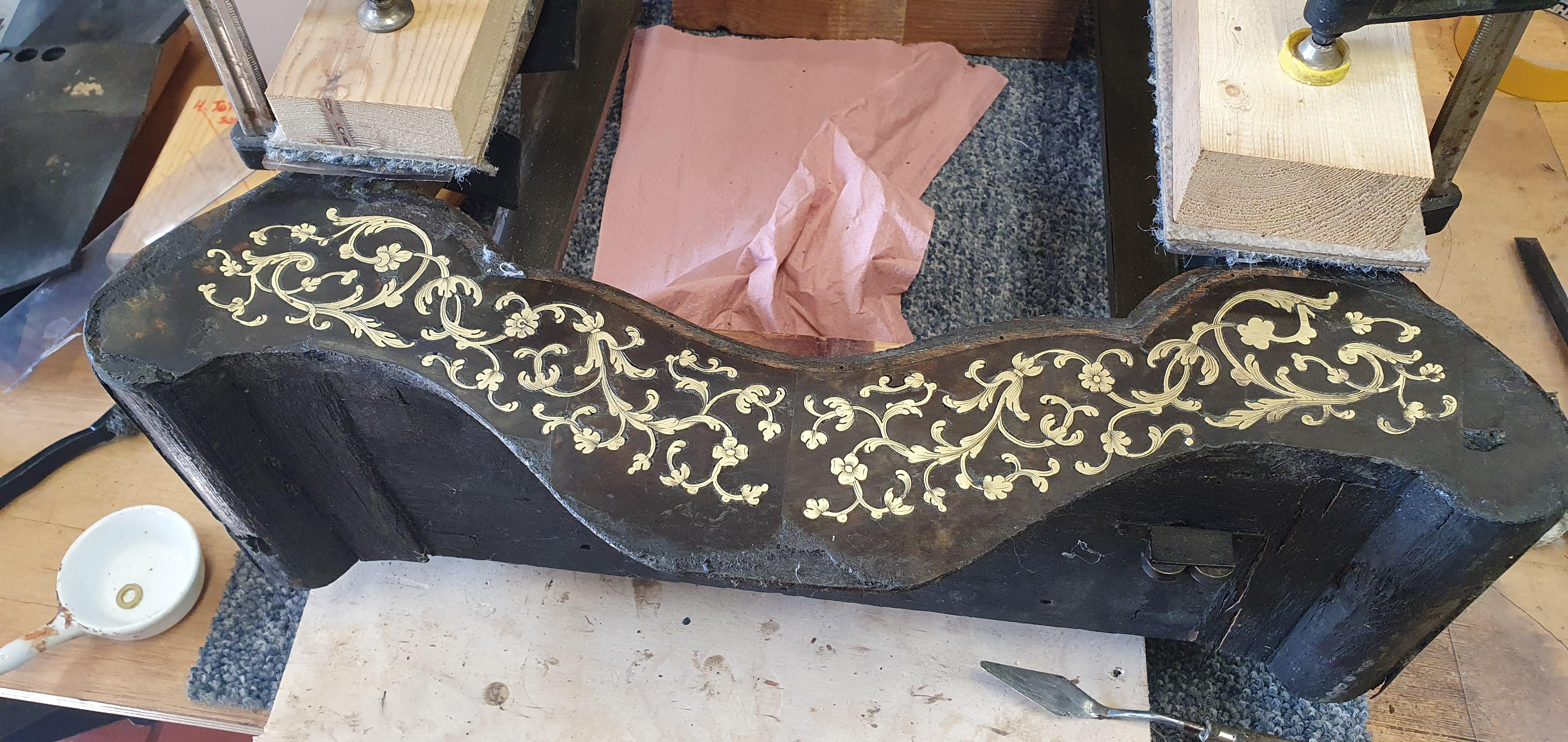 Réparation des pièces manquantes : Des pièces en laiton et des morceaux d'écaille de tortue manquants ont été découpés et façonnés pour compléter les parties endommagées du cartel.